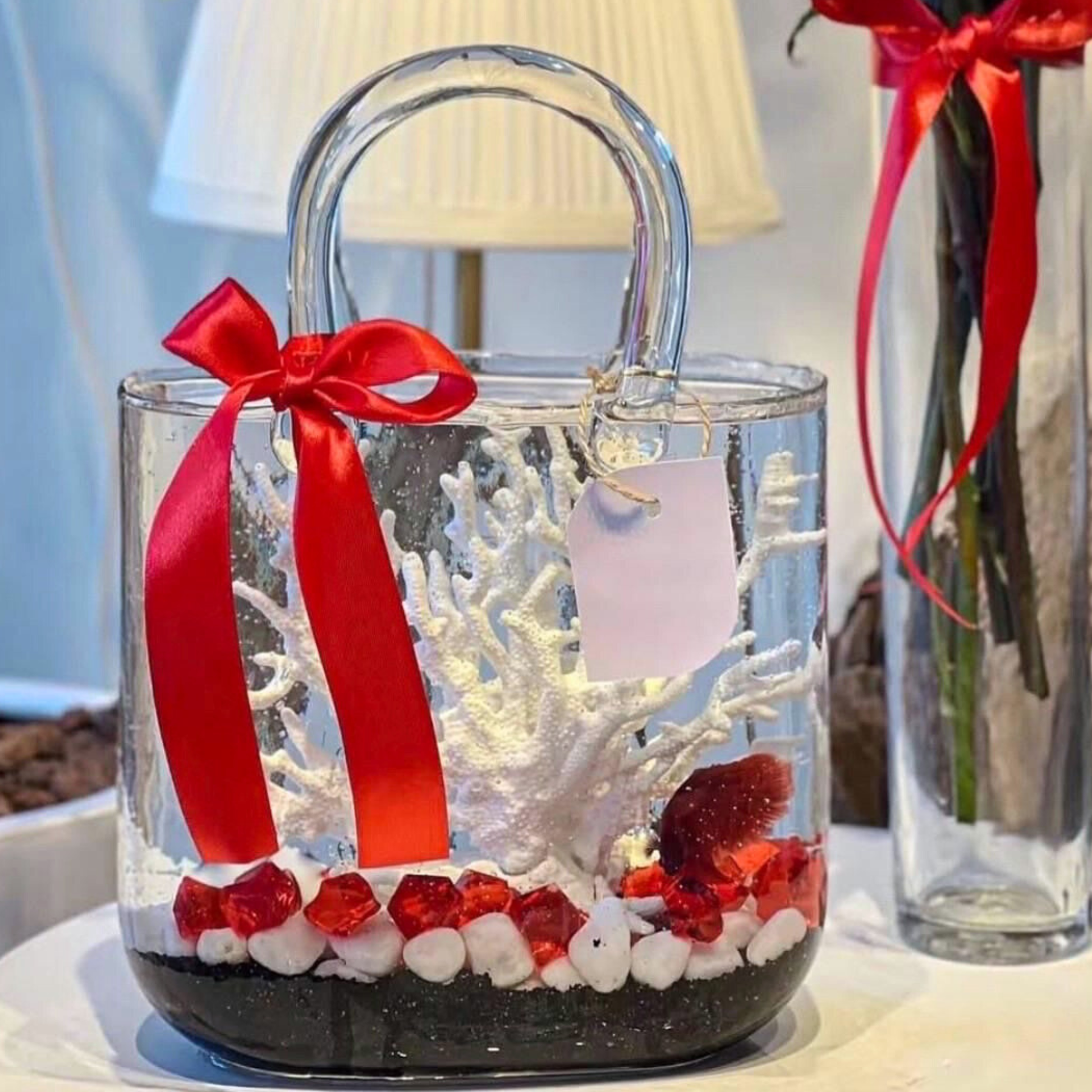 Dieses dekorative Mini-Aquarium in eleganter Handtaschenform ist eine besondere Geschenkidee für stilvolle Wohnräume.